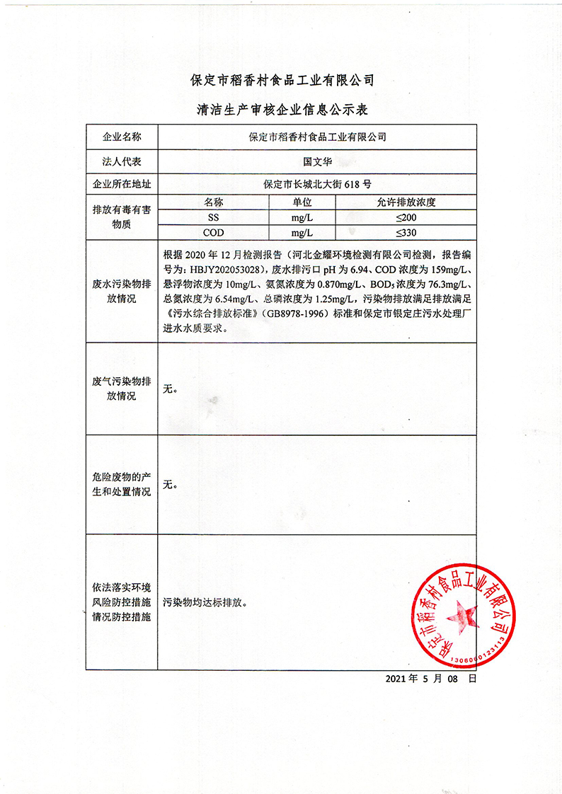 保定稻香村食品清潔生產(chǎn)審核企業(yè)信息公示